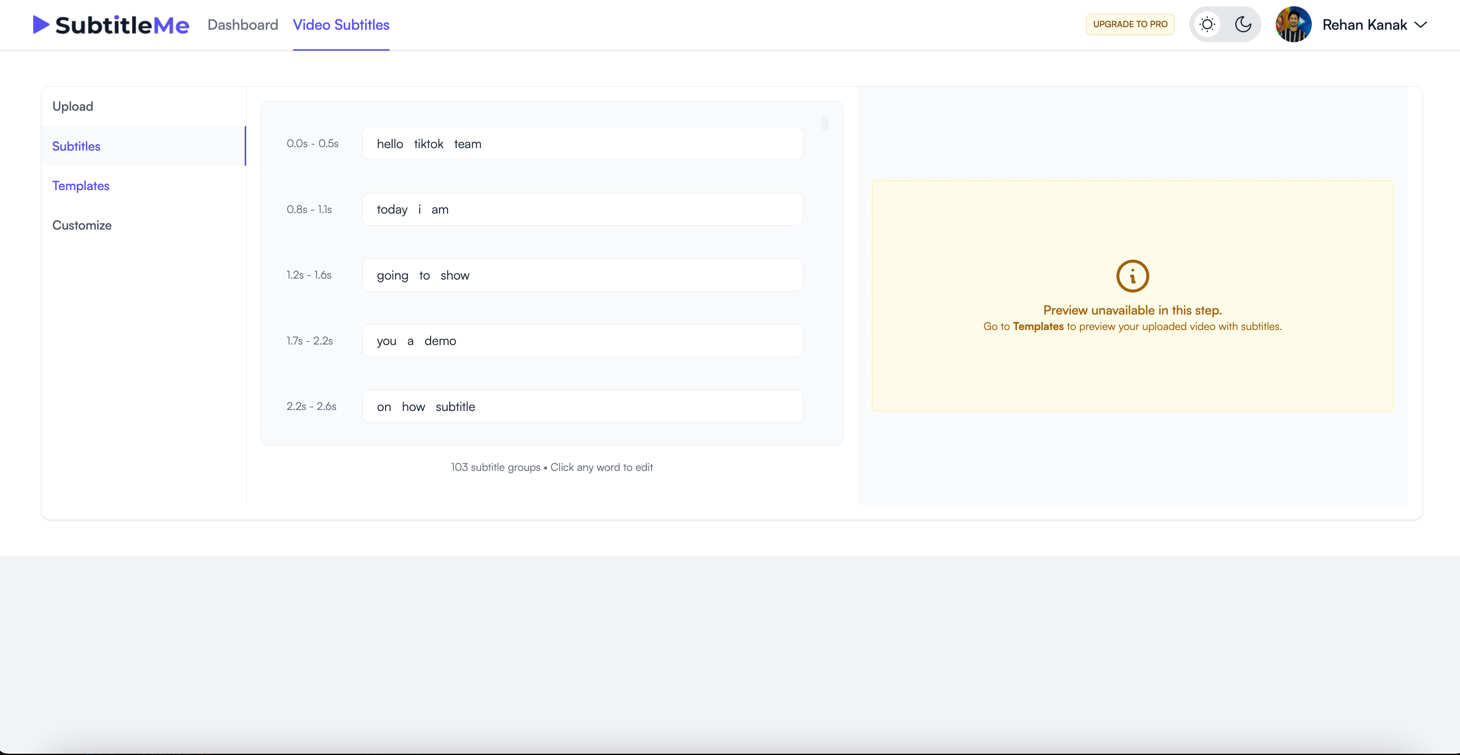 Upload your video to SubtitleMe.ai. The AI will automatically generate clean, editable subtitles in seconds.